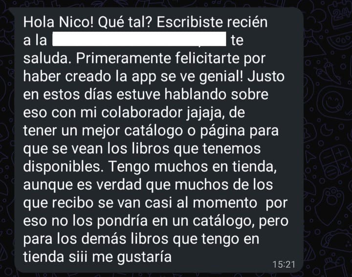 Con la segunda, la cosa cambió. Me dijo que le encantó la plataforma, que era justo lo que estaba necesitando y que estaba super interesada en probar. Le ofrecà usar TiendaPy sin costo (ahora mismo me interesa el feedback más que la plata) y la reacción fue super positiva.